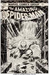 ".. This "Amazing" cover has been described as simply one of the best Spider-Man covers ever created. It has a nice bit of history as well, as it is an homage to the iconic cover of Amazing Spider-Man #33 by the incredible Steve Ditko. Most sources list the art as by John Romita, Senior. However, this original art is signed at the bottom by both Gil Kane and Romita Sr. Furthermore, on the backside, in Romita Sr.'s own handwriting it reads "Gil Kane + John Romita" and is signed by JRSR again. Given the overall "Romita-ness" of it, our best guess is that Gil Kane supplied the breakdown and Romita provided the finished art.."