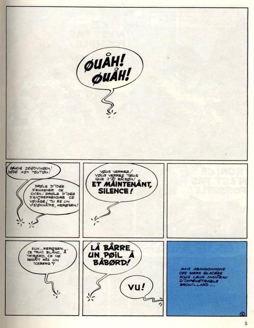 Cette planche regorge de ces petits détails qui font le sel de la série; Les Vikings (qui sont des Danois) parlant avec des « ø » et des « å », lettres spécifiques à leur langue (ce détail visuel permet de mettre en lumière la difficulté de communiquer avec les Gaulois, processus utilisé déjà maintes fois par Goscinny). Leur chef Kerøsen posant le pied sur le sol américain, déclarant: «Un petit pås pøur møi, un grånd bønd pøur l'humånité !», clin d'œil bien evidemment à la phrase de Neil Armstrong posant le pied sur la Lune: «That's one small step for [a] man, one giant leap for mankind» (en français: «C'est un petit pas pour [l'] homme, [mais] un bond de géant pour l'humanité»). Mais encore les têtes de cet équipage improbable avec leur dogue danois harlequin du nom de Zøødvinsen (Zoo de Vincennes) qui se prend une belle gamelle lorsque son drakkar accoste violemment avec l'onomatopée "crøøåk!".