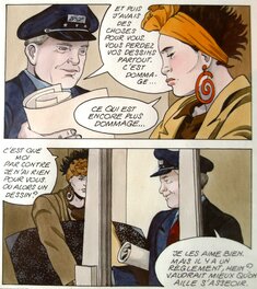 La locomotive électrique n'a pas de pantographe et d'ailleurs la voie de chemin de fer n'a pas de caténaire. Mais bon, Goetzinger est une artiste. Le train en pleine vitesse est agréablement représenté en case 6 comme un ruban de couleur.