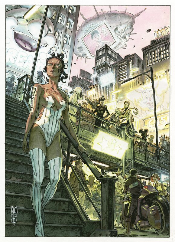 It is a little over one year ago I visited with my friend Arnaud in Paris. He showed me his art collection and I learned about several new artists. Of all the pieces I saw, the one I was most impressed with was a commission he had by Roberto Ricci. I looked at it several times and I have been back to his gallery many times to visit it too. I have since added a piece of art by Roberto to my collection and early on I contacted him about doing a commission. He has been very busy with personal and professional obligations but the commission is finally done. I asked for a lot to be added in the back ground. The pieces features Ishrat, a character from his BD Urbain. I really like the look she had with the logos on her. It was something quite unique and that stayed with me. The world or Urban is very much that of Blade Runner and so I asked for the some of the Blade Runner characters to appear in the back ground. Zora, Pris, Rachel and Deckard all appear as does the blymp with the advertising. You will also see Kaneda and his bike from Akira and Leelou from the 5th element. It was a fun process going through this with Roberto (at least for me) and he kept me up to date often. I will take delivery of this piece in Lucca in two weeks. There are some work in progress pictures as well including the 7 initial layouts that were proposed to me.