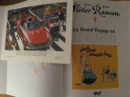 Dany, illustration originale figurant nos 2 sympathiques héros, Olivier Rameau et Colombe Tiredaile, en page de garde de l'album TL "Le Grand Voyage en Absurdie". Pleine page aux encres de couleur. Signée.