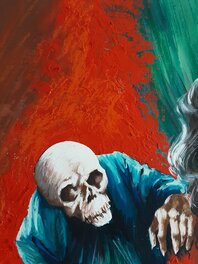 Toujours les couleurs de fond violentes et appliquées en touches épaisses (voir l'une des images en détail). Toujours un ou des monstres grotesques et toujours une victime. Ici un homme étranglé par le Crâne et cette femme au cri arrêté en plein climax.