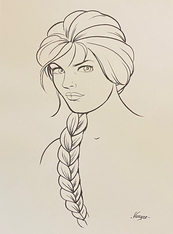 Jean-Christophe Vergne, illustration originale représentant une jeune femme noble à la tresse, "Le Coeur de Lion". Réalisée probablement pour un ex-libris. Encre de chine sur papier à dessin. Signée.