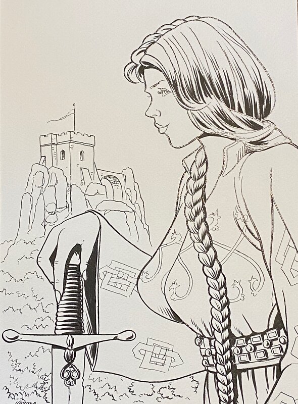 Jean-Christophe Vergne, illustration originale, Gente Dame à l'épée devant sa tour forte,