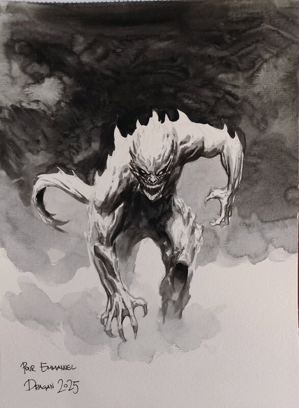 Dessin dédicacé sur une feuille libre au format A4 (Commission) représentant une créature de "et la hache passe entre d'autres mains", le tome 32 de la série " La geste des chevaliers dragons"