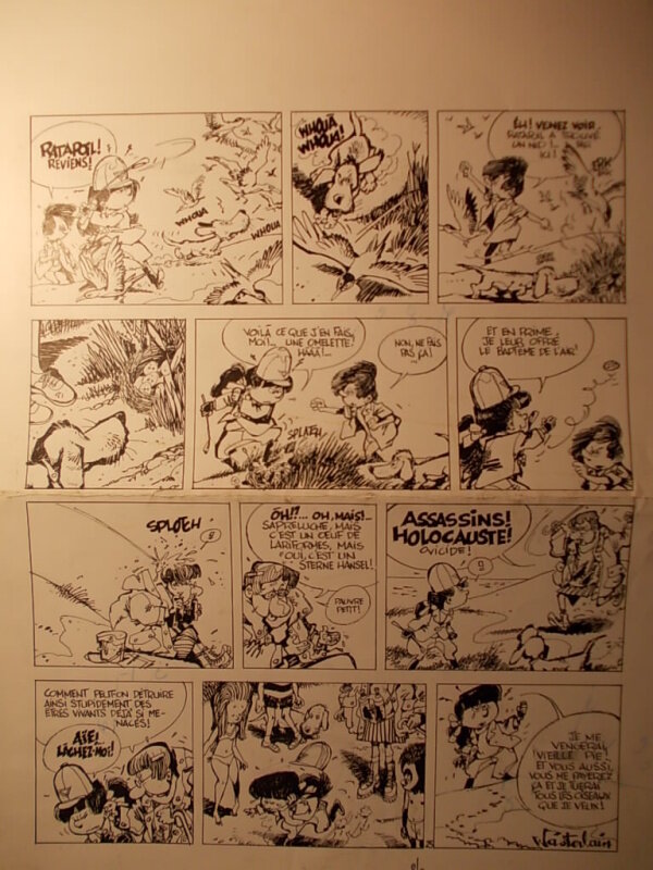 Marc WASTERLAIN : encre de chine pour la planche 25 des Belles Vacances, publiée dans le Journal de SPIROU n° 2161 du 13 septembre 1979. Récit repris dans le troisième album du Docteur Poche, Karabouilla, DUPUIS, 1980. Planche signée en bas à droite.