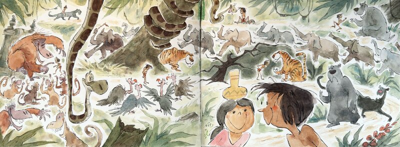 Double page issue de "Duo", un projet artistique collaboratif d'envergure internationale, initié il y a plus de dix ans par les illustrateurs Gérald Guerlais et Sébastien Mesnard. Le concept repose sur deux carnets itinérants, transmis de main en main, permettant à plus de 110 artistes de former 57 duos. Ces artistes, issus de l'illustration, de la bande dessinée et de l'animation, ont uni leurs talents pour créer des œuvres conjointes, transcendant les distinctions de genres et de médias.