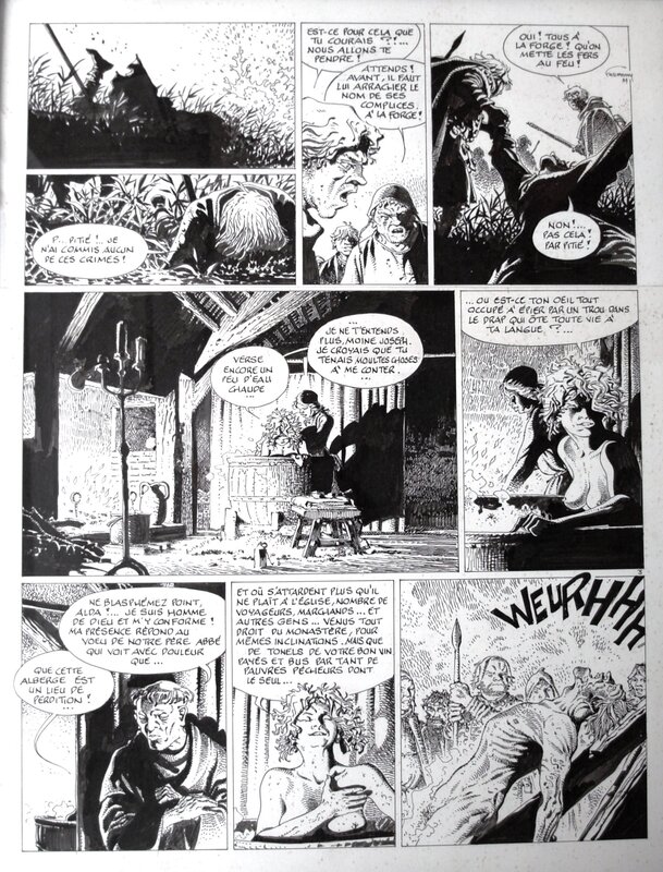 Une planche qui montre bien les souffrances et la barbarie de l'époque, le trait cassé de Hermann y ajoutant la réalité. Une maîtrise du noir et blanc que l'on ne peut plus apprécier à sa juste valeur une fois le dessin mis en couleurs. Une planche particulièrement travaillée et une très belle composition. Un effet de relief sur certaines cases.