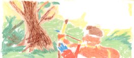 Ce récit de 55 planches, publié le 5 septembre 1969, est le quinzième de la série, soit un des derniers avec des héros qui ont grandi et qui ressemblent plus à des adolescents qu'à des enfants. J'aime la composition de cette planche avec cette flèche qui traverse le cadre au centre. Yataca y a une présence "gauchère", uniquement en scène sur la partie gauche de la planche : sur la première case, il y est invisible mais bavard ; sur la seconde, il y est visible mais muet (avec ce visage aux yeux très "Tacconi", cf. images additionnelles) ; enfin sur la 4e case, il nous gratifie de son cri à la Tarzan. J'aime les jeux de couleurs entre le feuillage bleuté de l'arbre et l'anneau de tatouage de l'Indien. En dernière case, on aperçoit Itza et Ram, deux personnages importants de la série, ne manque que Téoti.