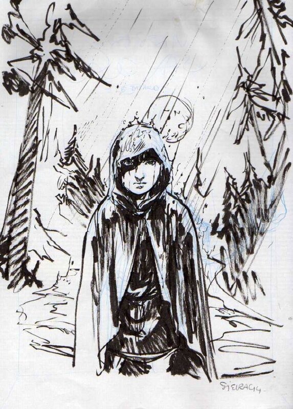 Ce projet ne sera jamais concrétisé, Laurent Sieurac ne s'étant pas vu confier la réalisation des couvertures des deux albums de la série qu'il a dessinés. Cela étant, je trouve que ce dessin pourrait s'appeler "Frodon sous la pluie".