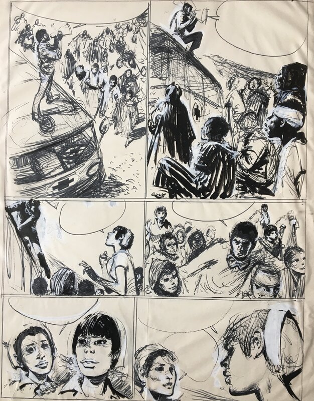 Croquis préparatoire pour la planche 7 de cette aventure de 12 pages dessinée par Mitacq , parue dans le Spirou 1841 et dont René Follet a assuré tous les crayonnés . Scénario de Jacques Stoquart .