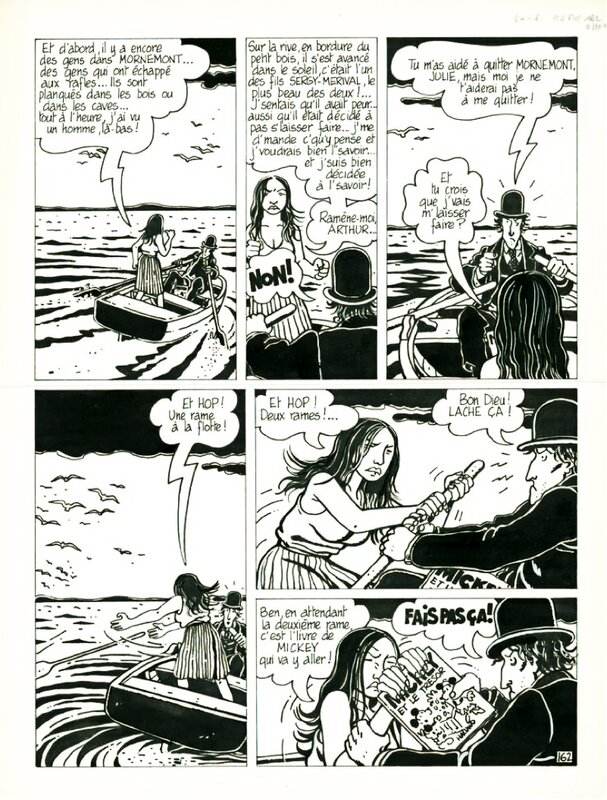 Arthur Même, totalement fou et notamment fou de Julie, finit par apparaître comme le moins aliéné du "Pays clos", qu'il voudrait transformer en une "grande éponge sanglante" (voir autre planche dans cette même galerie). Et dans cette planche 162, l'avant-dernière de l'album, le drame ultime se noue: Julie se refuse à suivre Arthur au bout de la mer. Elle veut revenir dans ce qui reste du Pays clos, mais Arthur reste sourd à ses demandes.