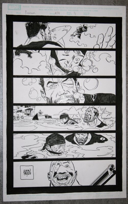 Confrontation titanesque entre le "Punisher" et son pire ennemi "Barracuda", qui semble remporter ce premier round ...Plongée, contre plongée, cadrage cinéma, le héros, le méchant, un requin...;) Tous les ingrédients sont là ! J'espérai pouvoir acquérir un jour une belle planche de Goran Parlov sur cette série . Voila qui est chose faite :)