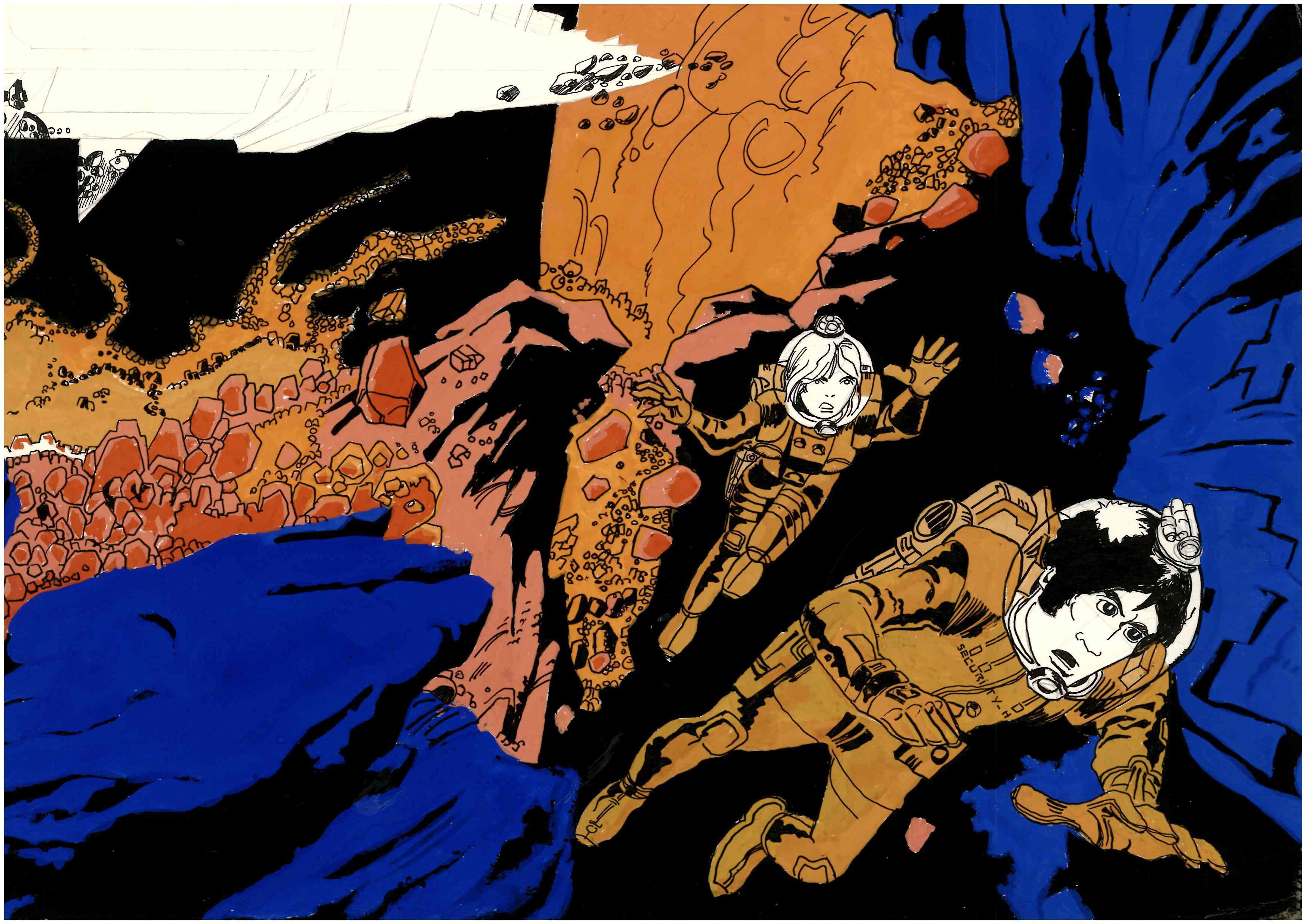 Dans Métal, je commence donc au rotring, avec des planches de science-fiction. Je passe ensuite au rock. Avec Manœuvre, on crée l’album Captain Futur, d’abord à la plume puis au pinceau. Les planches sont réalisées au fur et à mesure des publications : les pages sont dessinées au jour le jour. On ne sait pas à l’avance ce qu’on fera pour le numéro suivant. Je poursuis avec le rock à travers des numéros spéciaux qui commencent à paraître dans Métal.
