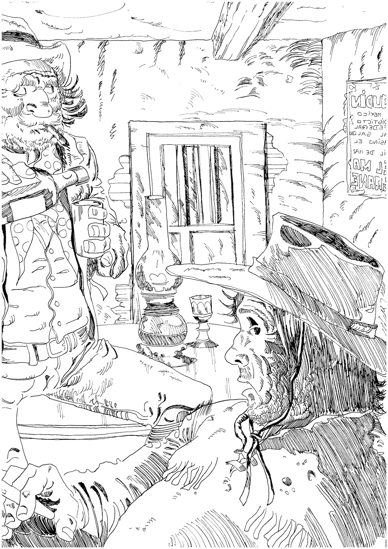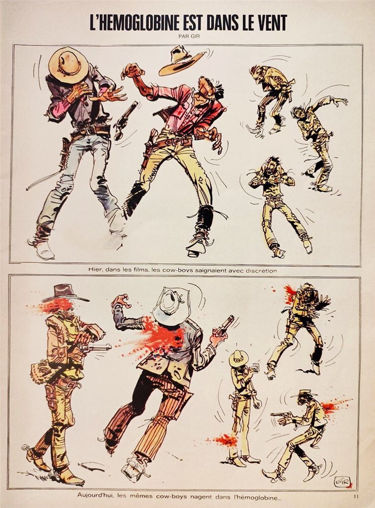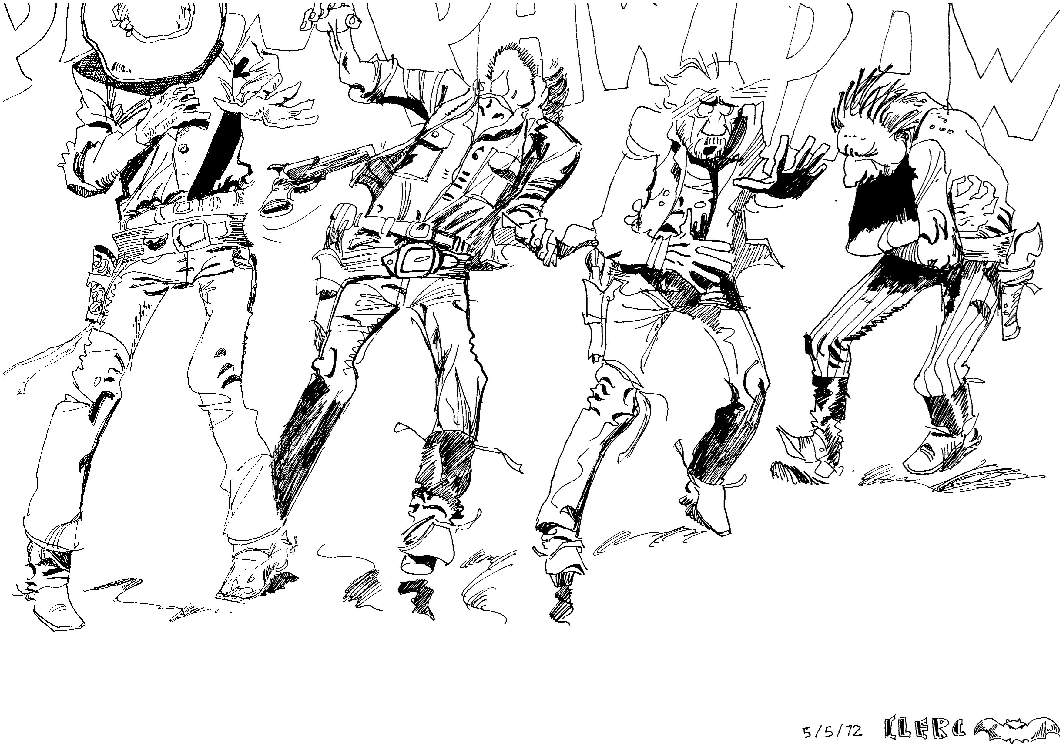 En 1980/81, je passe au pinceau. Avant, j’étais à la plume et au rotring, une folie furieuse. À partir d’une case du numéro Spécial hémoglobine de Pilote, je redessine du Giraud où des types se font flinguer : mon trait est trop léger, mon rotring trop fin. Je ne sais pas l’utiliser. Je n’ai pas les bons instruments, je n’ai pas fait d’école de dessin. Pour travailler au rotring, il faut être Tardi : lui seul sait l’utiliser avec la bonne puissance. Tout ça pour dire que les dessins évoluent aussi avec les instruments qu’on utilise.