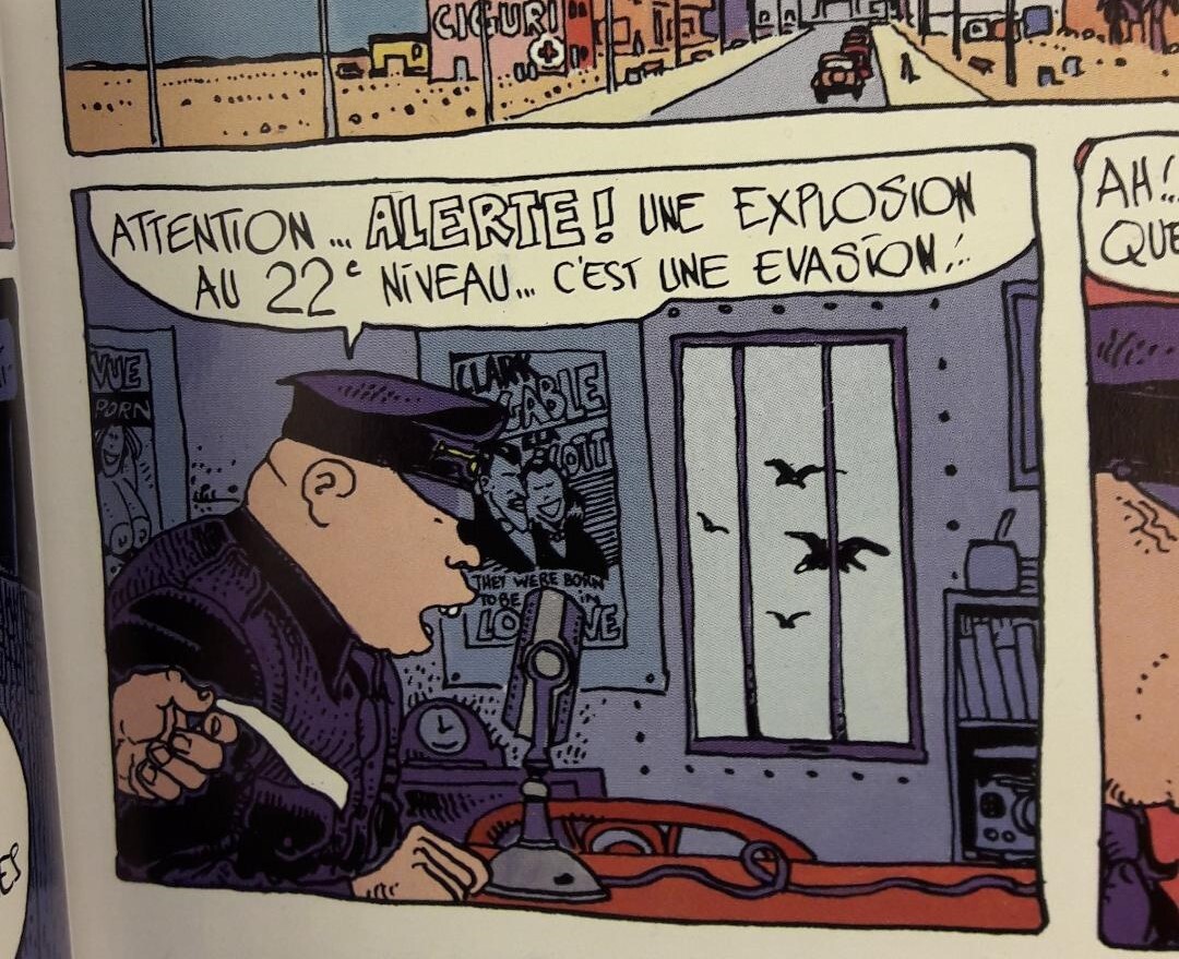 Serge Clerc, dessin des affiches au mur derrière le personnage, dans Tueur à gages de Moebius (version colorisée), intégrale noir p.6, Éditions Dupuis, 2017 (prise de vue de l’auteur)