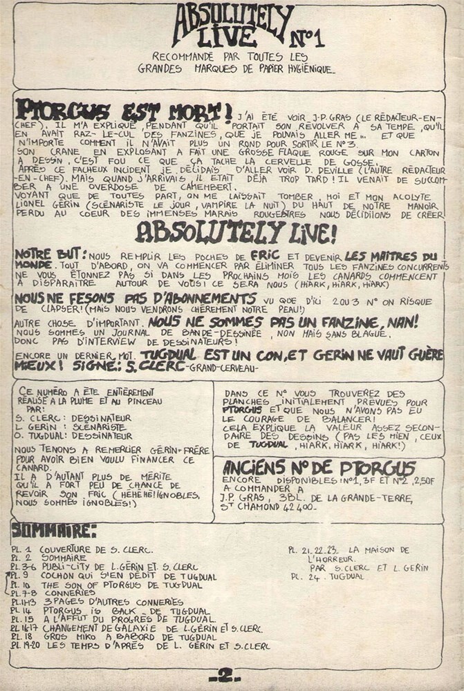 Serge Clerc, Fanzine Absolutly Live #1, éditorial, 1974 (source : gravezone)