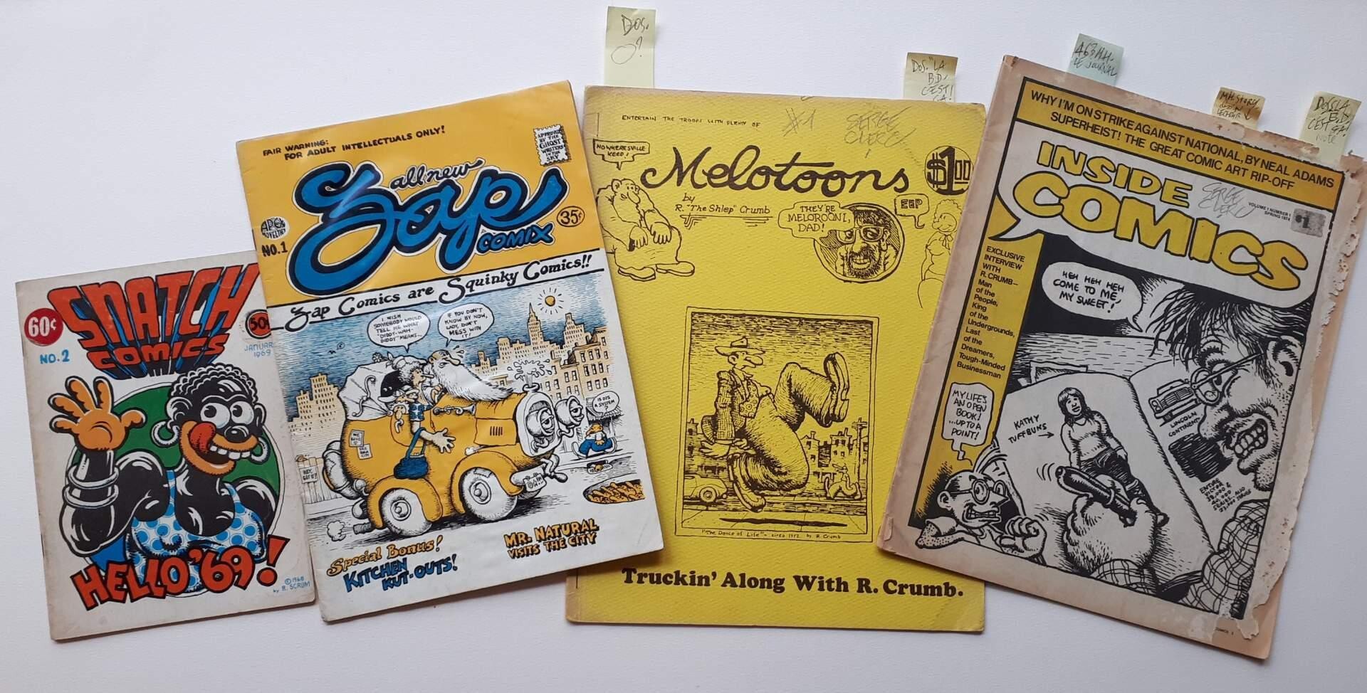 Robert Crumb, Snatch #2 – 1968 / Zap #1 – 1967 / Melotoons #1 – 1973 / Inside Comics VOL #1 – 1974 (prise de vue de l’auteur)