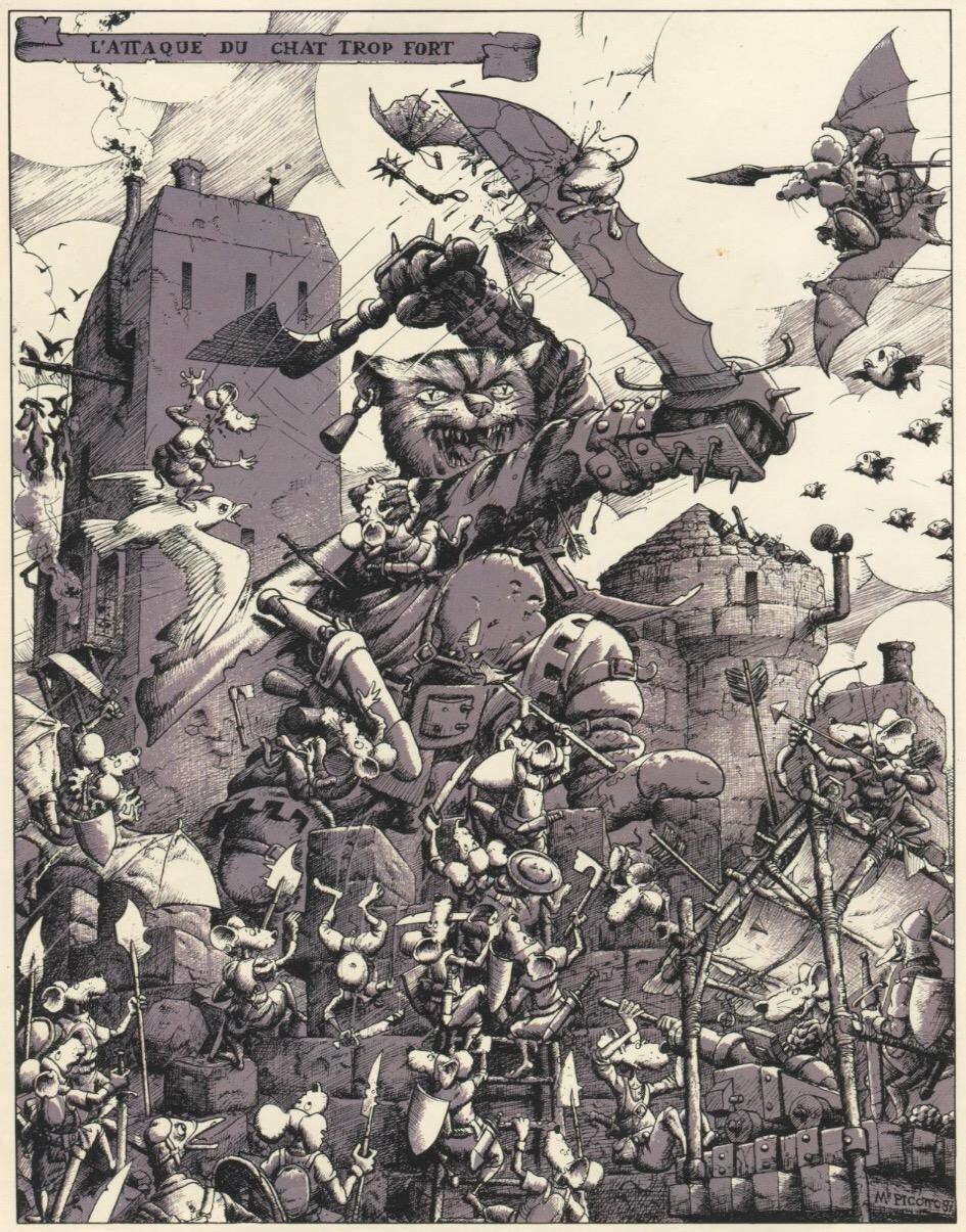 Picotto, L’Attaque du chat trop fort, dessin inédit, allusion au Chat botté illustré par Gustave Doré, 1990