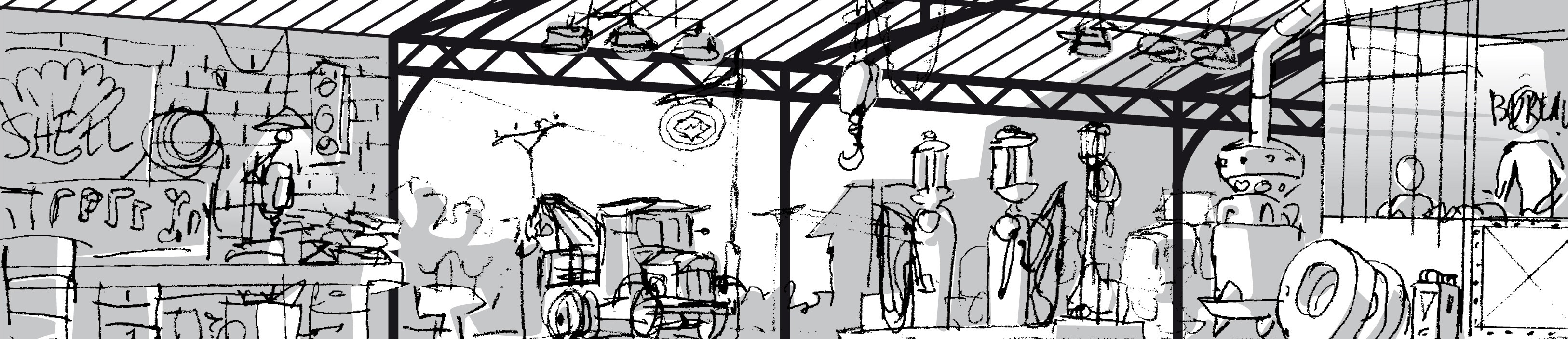 Picotto, illustration murale pour garage de collectionneurs, dessin sur Adobe Illustrator mélangé avec des dessins à la main, 1989