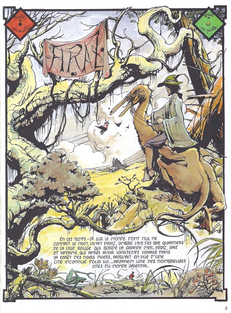 Par contre, j’étais très barré sur la mise en page, j’avais eu des cours solides par Moebius, et puis je regardais beaucoup ce qui se passait aux États-Unis ; je piquais un peu partout, sur Michael Kaluta, Bernie Wrightson, Jeff Jones… J’essayais de refaire tout ça à ma sauce, j’avais un côté très cinéma : dans Firaz, il y a beaucoup de références à l’univers de Jean Cocteau. Quand j’étais môme, j’ai été très marqué par son film La Belle et la Bête ; son esthétique m’a influencé très longtemps.