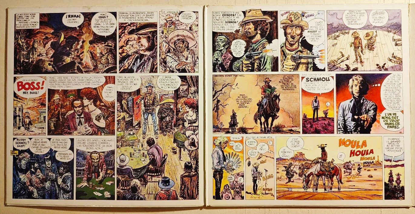 J’ai d’ailleurs une anecdote personnelle amusante. C’était au tout début de ma rencontre avec Moebius. À ce moment-là, il réfléchissait à une pochette de disque pour Eddy Mitchell. Je venais de faire une bande dessinée qui avait fait marrer Moebius : elle n’était pas terrible mais elle était amusante. C’était une parodie de western avec un ton un peu original qui s’appelait Sept Colts pour Gina. Je signais à l’époque « Schmock ».