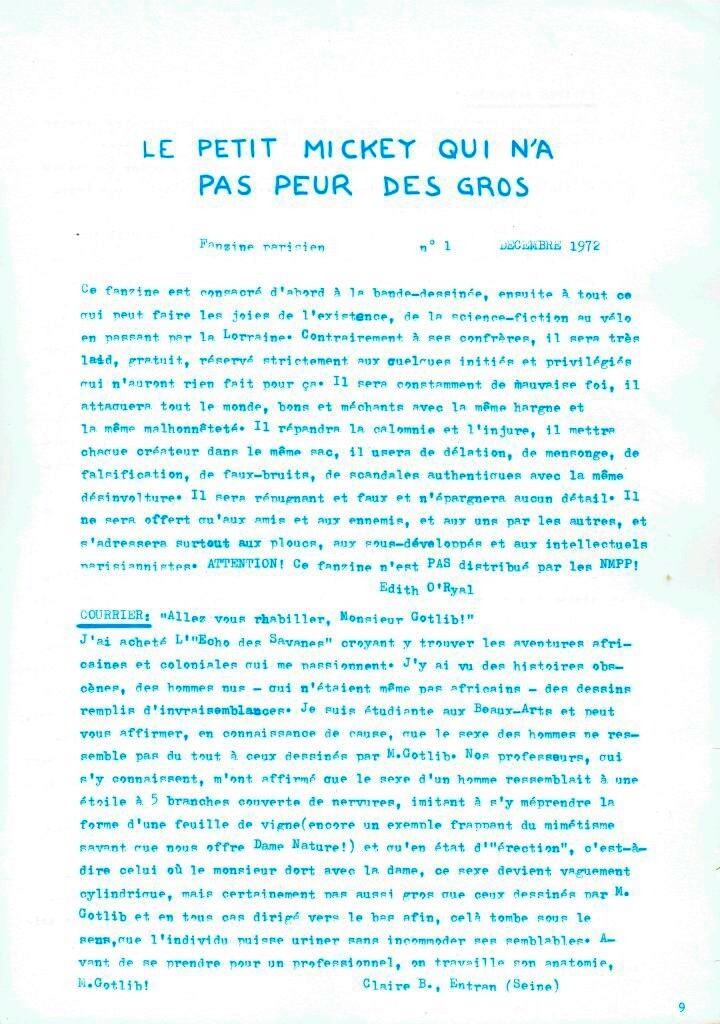 Je les envoie aux personnes que je connaissais, donc à Charlie, à Wolinski, Cavanna, Choron, à Gotlib, à Bretécher, sans doute à Mandryka, et à plein d'autres fanzines. Et là c'est l'émeute... Tout le monde m'appelle. Prudemment, j'avais mis un seul contact, Christine Poutout, qui était le nom de jeune fille de ma femme. C'était la première fois qu'il y avait un nom féminin comme responsable de fanzine. Gotlib me contacte, Claire Bretécher envoie à Christine Poutout une lettre de deux pages pour l'encourager avec une image pieuse de la Vierge Marie pour lui porter bonheur.