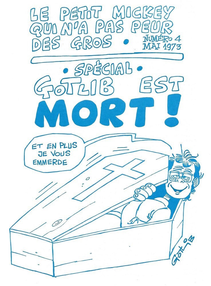 J'ai appelé Choron pour le remercier, il m'a dit « ouais, y a des idées la d'dans, c'est pas mal... » Bon OK, je me suis dit que ça n'allait pas aller plus loin. Et puis, quand Wolinski m'a demandé un article sur le salon d’Angoulême, je venais de rencontrer Gotlib, on était devenus copains, on avait fait un numéro du Petit Mickey Spécial « Gotlib est mort », où il s'était dessiné en train de sortir de son cercueil.