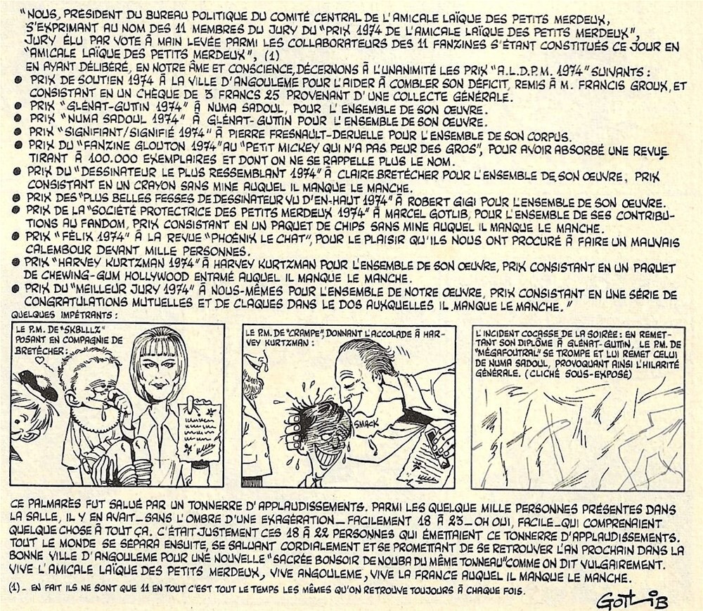 Du coup, on s'est réunis avec un petit groupe de fanzines, on a été onze. On a créé l'Amicale Laïque Des Petits Merdeux (ALDPM) : c'est moi qui avais fait rajouter « laïque » parce qu'il y avait des amicales laïques partout à l'époque et que ça faisait bien d'en être. Pourquoi Les Petits Merdeux ? Eh bien parce que parmi les organisateurs, il y avait aussi Claude Moliterni qui était un peu de « l'autre bord » pour ce qui était de la conception de la BD : c'était un des grands meneurs de l'époque de l'Âge d'or. Quand il a vu tout le foin qu'on faisait, il a dit : « Mais qu'est-ce que c'est que ces petits merdeux ? » Alors immédiatement, on s'est emparés du truc ! On a d'ailleurs été très critiques de ce que faisait Claude pendant des années.