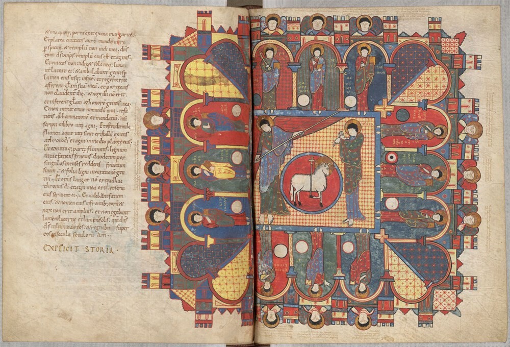 Beatus de Saint-Sever, architecture de la Jérusalem céleste (feuillets 207v-208r), XIe siècle.