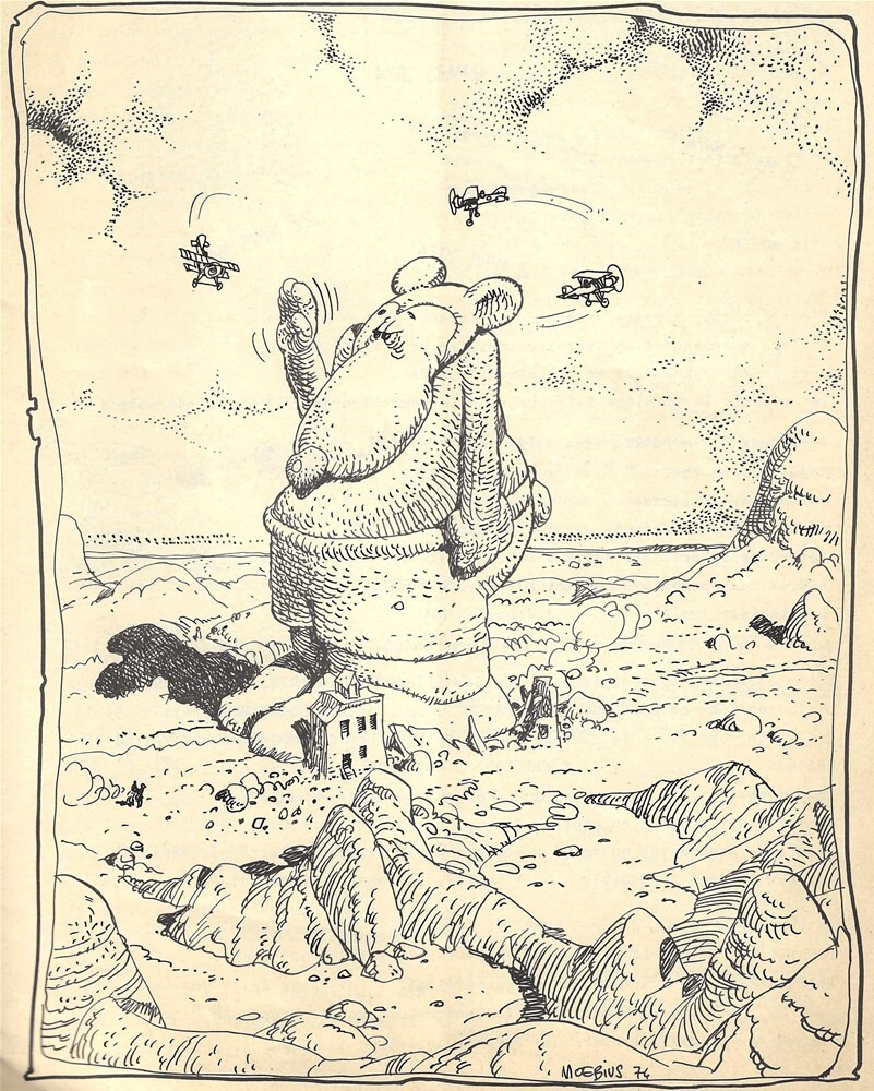 Moebius, illustration de couverture, fanzine Le Petit Mickey qui n'a pas peur des gros #7, 1974.