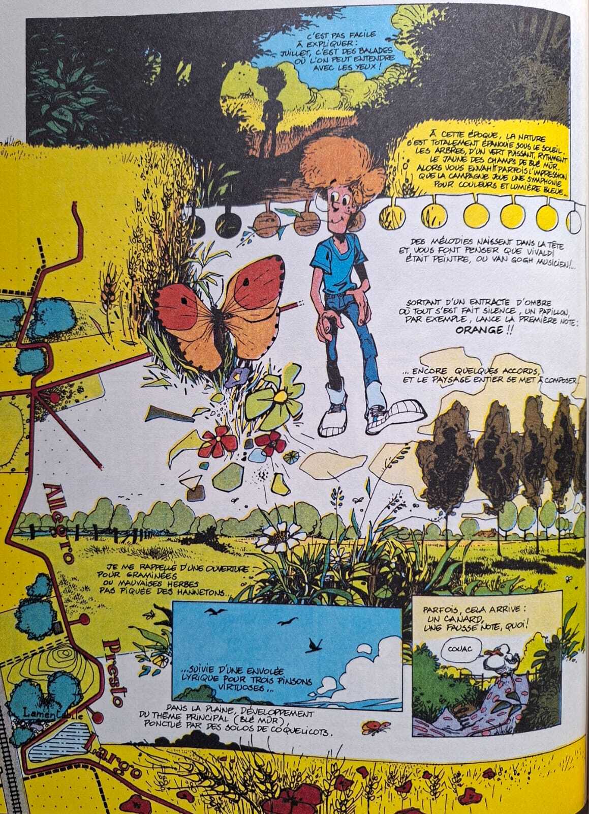 Cette série m'a beaucoup marqué, et les trois premiers albums ont été un vrai choc esthétique. Alors, certes, cette planche ne fait pas partie des premiers volumes, mais elle incarne bien l'émerveillement, la poésie et la tendresse qui émanent de cette série. À l'origine, elle a été dessinée en 1980 pour le magazine Spirou n° 2200 dans la rubrique Les Papiers de Broussaille. Frank l'a recréée en 2003, lors de la conception de l'album Un faune sur l'épaule. L'histoire et le texte sont modifiés, mais ce qui change le plus, ce sont le trait de Frank et Broussaille qui a mûri. Ce n'est plus un ado des années post-70 caché derrière de grandes lunettes, avec une touffe de cheveux qui explose au-dessus de son front et de longs pieds qui sortent de son jean "pattes d'eph", lui donnant cet air dégingandé. C'est à présent un jeune homme posé et épanoui qui porte certainement des verres de contact. À plus de vingt ans d'écart, ces deux pages sœurs sont les témoins de l'évolution d'un grand artiste. Merci Monsieur Pé, on ne vous oubliera pas.
